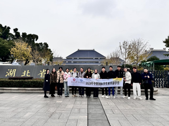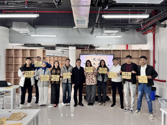 在艺术创意学院,国际学生观看了毕业设计作品展,亲身体验了漆扇制作和蓝染技艺。漆液留驻在扇面上形成图画的妙趣天成以及植物蓝靛“布里生花”的浑然天成,将中国传统文化的瑰丽精致展现得淋漓尽致。他们展示着自己亲手制作的作品,纷纷赞叹称奇,表示对荆楚传统文化有了更深刻的感悟。在工商管理学院,大家感受了宋代风雅“四艺”即焚香、点茶、挂画、插花的视听盛宴,亲自动手进行了仿宋点茶实操以及香丸制作,沉浸式感受了中国传统文化的独特韵味。他们表示,这些精妙的传统艺术深深震撼了他们,这些古老技艺不仅是中国文化的瑰宝,更是全人类共享的精神财富。在经济贸易学院,师生共同体验了书法之美,笔墨纸砚一一排开,领略汉字笔画间的深邃韵味,在老师的指导下,国家学生们与我校学生用毛笔共同书写了“友谊地久天长”的美好愿望。在校外实践教育基地湖北省博物馆,同学们与文物对话,触摸荆楚故事,探寻了荆楚大地悠久历史与灿烂文化的精髓。